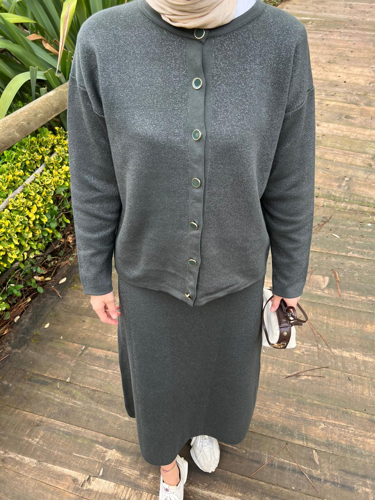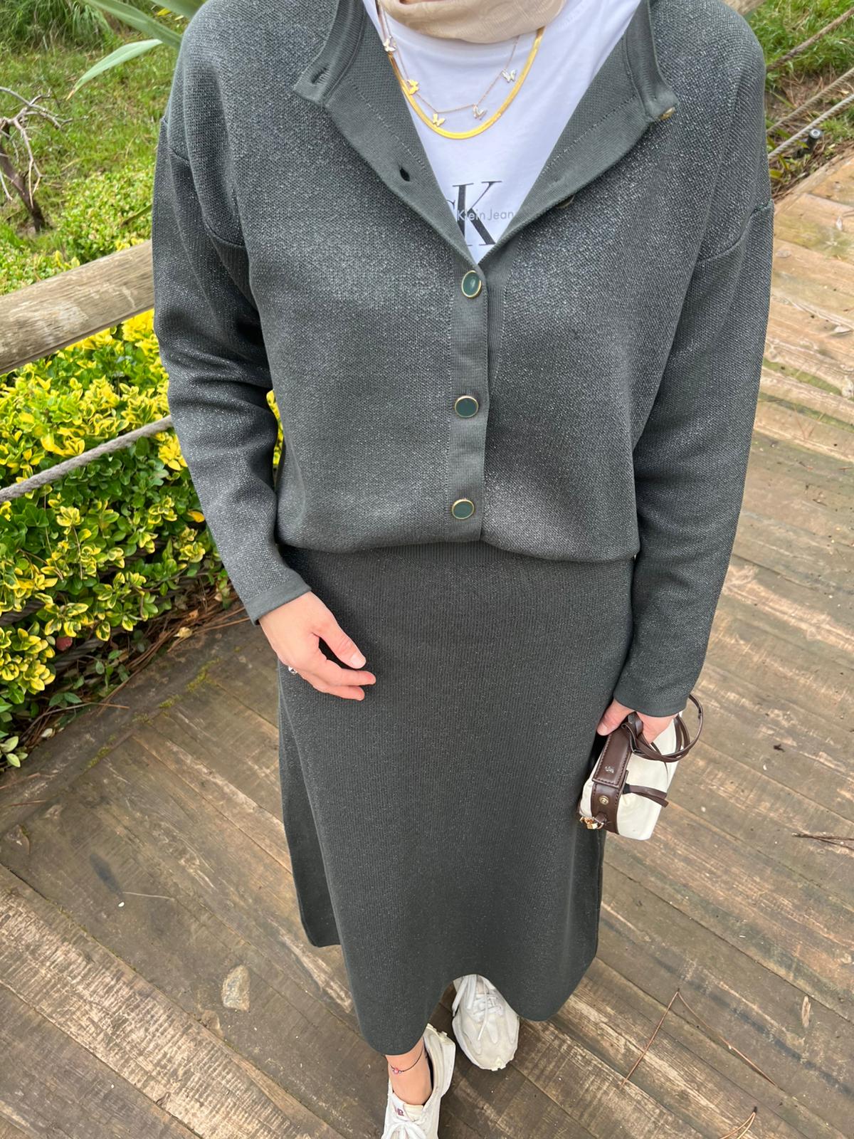 Koyu Yeşil Triko Simli Etekli Takım